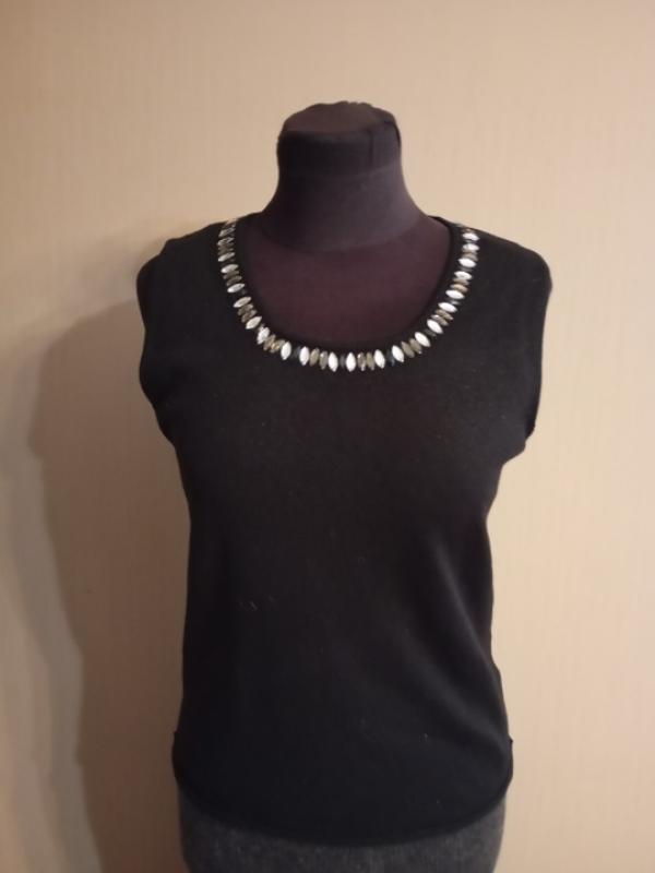 Элегантная шерстяная майка/топ от Carlo Colucci классического черного цвета. Главная особенность – украшенный круглый вырез горловины, декорированный плотным рядом блестящих декоративных камней (светлых, похожих на перламутр, и темных/серых). Это придает сдержанный вязаный топ роскошный, гламурный акцент, превращая его в идеальную вещь для вечернего или праздничного образа. Замеры: пог-48 длина - 62 указан размер - 40