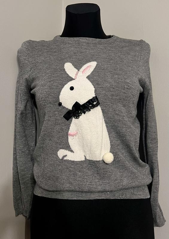 Мила сіра кофта з довгим рукавом, прикрашена об’ємною аплікацією у вигляді білого зайчика з бантом та пухнастим хвостиком. М’яка, приємна до тіла тканина з натуральної бавовни з додаванням кашеміру та ангори — забезпечує комфорт і ніжність на дотик. Чудово пасує як до повсякденних образів, так і для затишних домашніх вечорів. Розмір: S/M Склад: • 55% бавовна • 25% кашемір • 10% ангора • 10% еластан Стан: новий