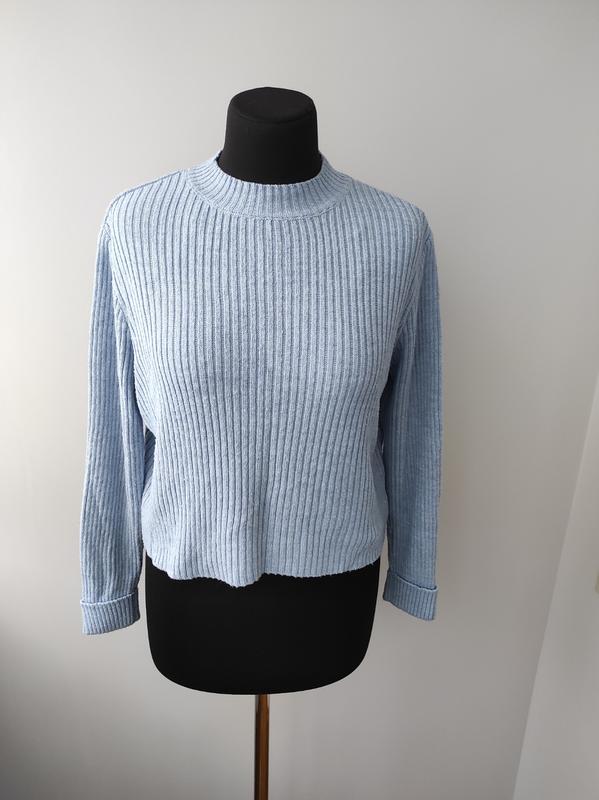 Базовый укороченный свитер в рубчик водолазка гольф L р от pull&bear Размер - L по бирке Цвет - голубой, меланж 100 % акрил Длина - 48 см Пог - 55-65 см Низ - 51-72 см Рукав - 54 см Плечо - 11 см