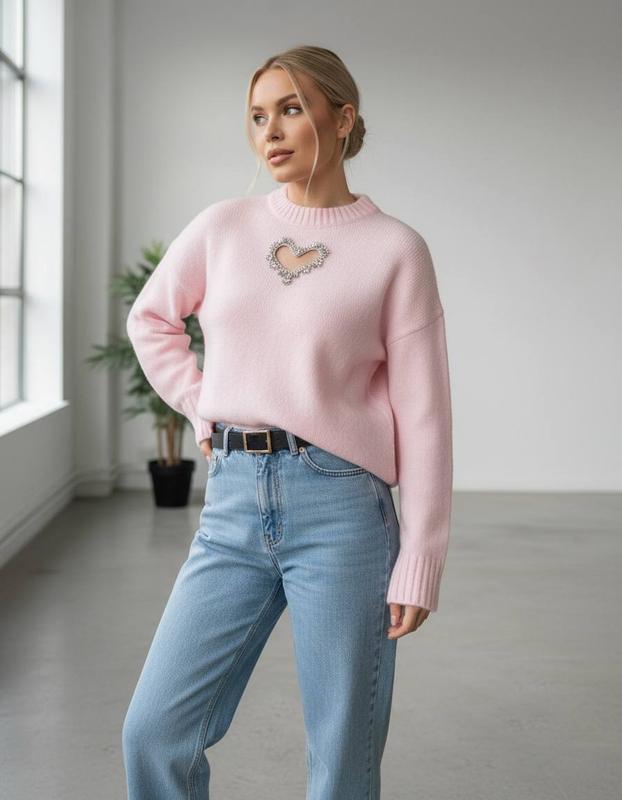 Светр Модель 2379 Размер универсальный 42/52 Цена 1020грн Машинная вязка Производитель Турция 🇹🇷 Цвета: розовый и белый Свитер имеет свободный крой с опущенными плечами и длинными рукавами с широкими манжетами. Особенностью модели является декоративный вырез в форме сердца на груди, обрамленный блестящими камешками, что добавляет образу романтичности и оригинальности. Свитер сочетает комфорт и стиль, создавая современный, нежный и женственный вид. Замеры: ОГ-61 см Длина-56 см Длина рукава от ворота- 75 см Погрешность замеров на трикотажных вещах +-2-3см