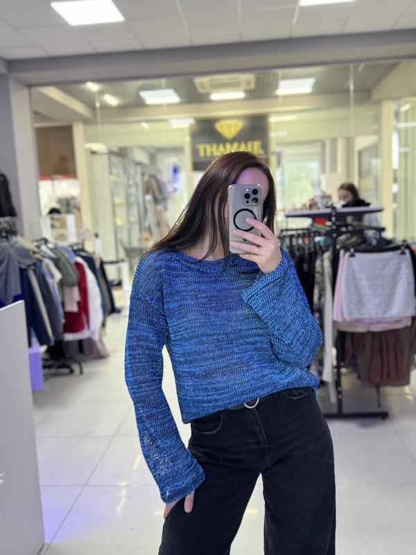 Светр від Zara Стильний в’язаний светр у глибокому відтінку синього. Легка ажурна в’язка, має вільний крій і подовжені рукави, що додають комфорту та невимушеності образу. Розміри: S, M, L
