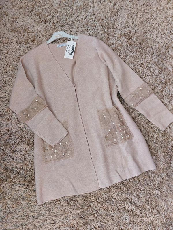 Кардиган женский с оригинальными кардиганчиками украшенными жемчужинками. Жемчужины прочно закреплены. Доступные размера S/M цвет беж L/XL цвет беж S/M Полуобхват по груди 57 см Полуобхват бедер 57 см длина рукава от воротника 69 см (в серой длине рукава 67 см) Длина изделия 77 см L/XL Полуобхват по груди 59 см Полуобхват бедер 59 см длина рукава от воротника 74 см Длина изделия 81 см