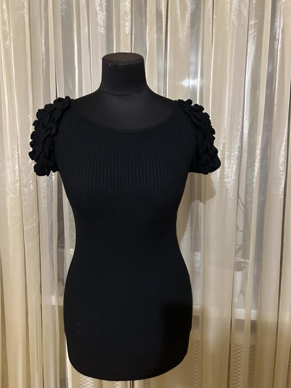 облегающее черная кофточка с короткими рукавами и рюшами на плечах. Тянется очень хорошо может подойти как на xs так и на л