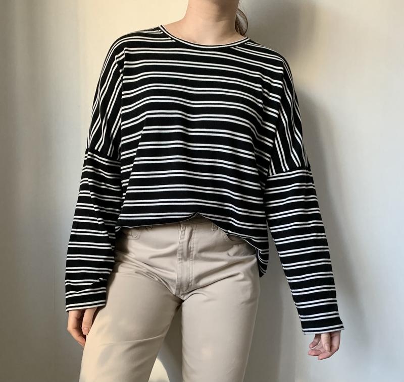 Светрик у смужку від Monki у розмірі М Довжина 60 см, має спущену лінію плеча, довжина рукава від горловини 74 см, напівобхват грудей 68 см У складі 100% катон Стан ідеал Вдягнуто на Л