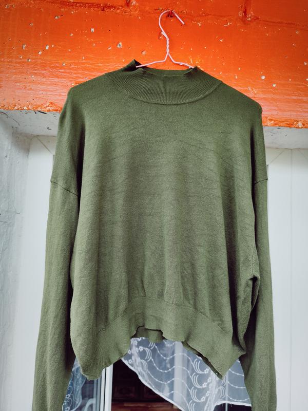идеальное состояние,мягкая приятная ткань, Бирка со составом зарезанная, очень хорошо тянется, цвет зеленый хаки, в реальности цвет и качество лучше, плечи приспущены, рукав фонарик длина 55 плечи 58 рукав 54 пог 66