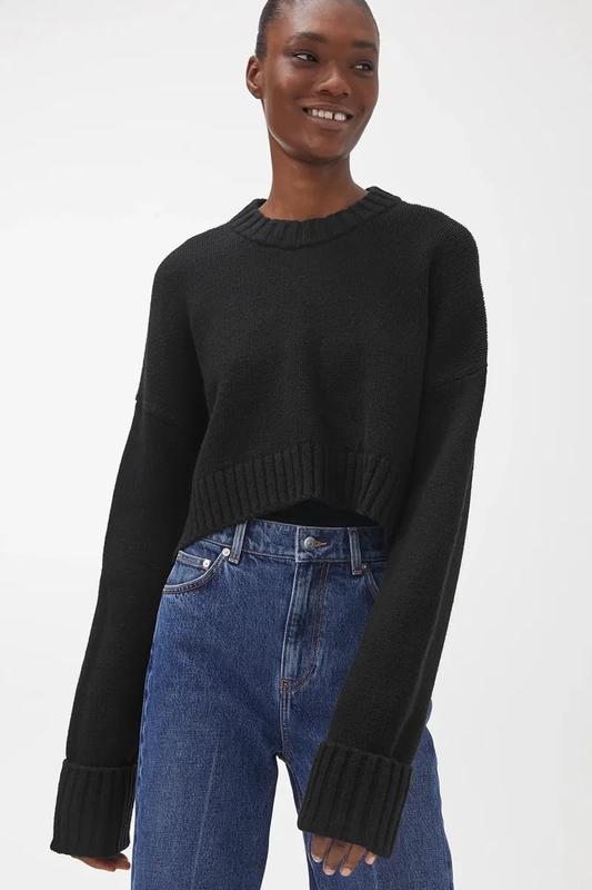 В'язаний светр із суміші вовни та нейлону, з круглою горловиною, опущеними плечима та вільною, але укороченою посадкою, довшою ззаду.