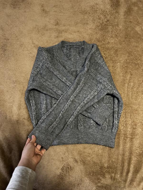 Напівобʼєм грудей - 53 см Напівобʼєм талії - 38 см Довжина по спині - 54 см Довжина рукава від горловини (рукав спущений) - 63 см Сезон - осінь/зима Принт - косичка Теплий, светрик, не колиться, без дефектів.