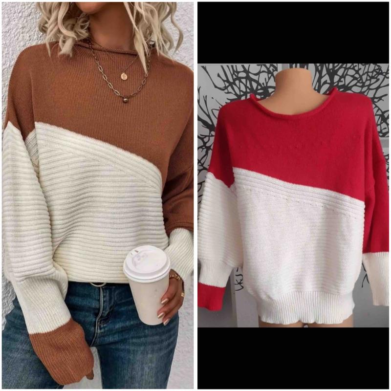 Это красно-белый вязаный свитер с широкими рукавами.Длина 66см.Пог62см.Пот44см.Рукаль42см.