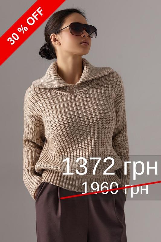 Розслаблений светр з напіввовняної пряжі з включенням віскози. Високі функціональні манжети на рукавах та по низу виробу. Комір-поло, що легко драпірується. Довжина 58 - 61 см (+- 2 см). Ширина у спокійному нерозтягнутому стані 45 - 50 см., у розтягнутому стані 53 - 58 см. Довжина рукава 49 - 51 см + ширина плеча 15 - 18 см.