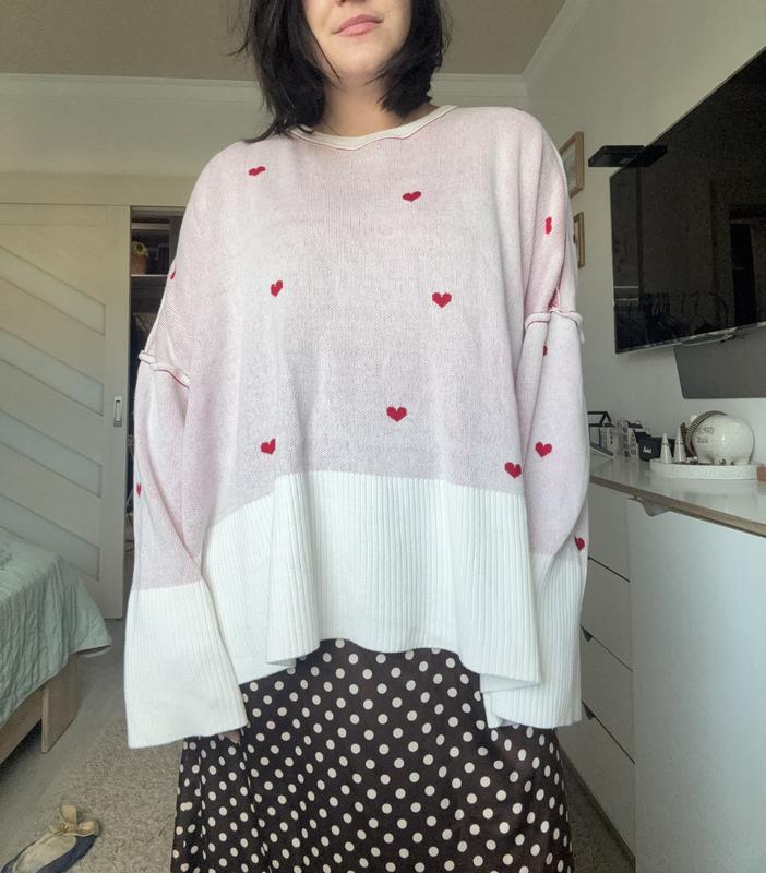 Світер aveclo, розмір універсальний, є жовті поями на рукаві і ззаду трохи поліз на фото видно. Потребує хімчистки. Одягнено на ріст 167 см.