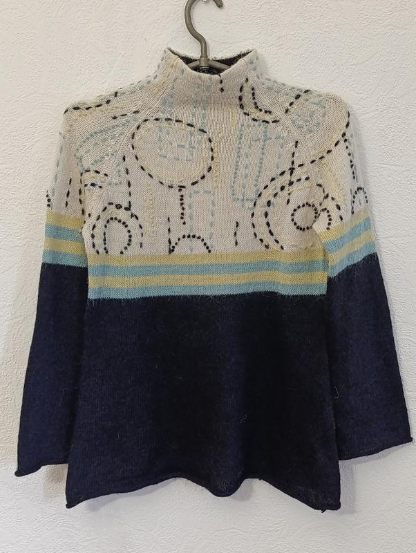 Уютный свитер с абстрактным узором от бренда HOSS Homeless Мягкий, теплый и стильный. Верх бежевый с оригинальным принтом, низ и рукава черные полоски в желто голубых тонах. имеет высокий воротник. Идеально под джинсы или юбки.