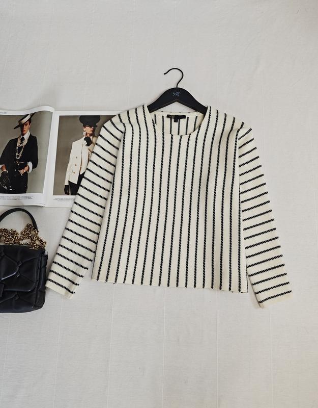 🌿 свитер бренда Maje свободного кроя, плотный, красиво держит форму, в составе шерсть 59% молочный полосатый Размер:1 Замеры:ПОГ 57 см, длина 51 см, рукав от горловины 61 см