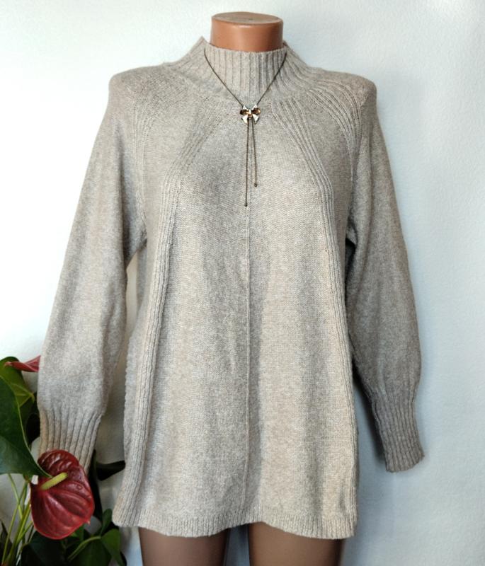 Классный тоненький свитер джемпер реглан, сзади немного длиннее, по бокам большие разрезы, низу идет трапецией. Цвет бежевый, фото немного искажает. Замеры: длина спереди 64 сзади 69 рукав от горловины 70 пог 56-78 пост 61++++, хорошо тянется