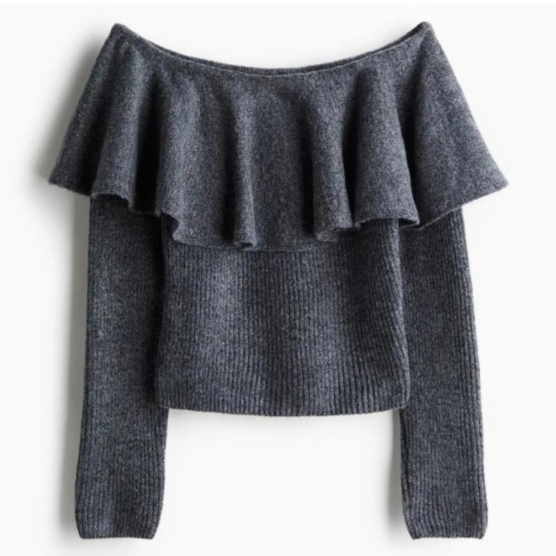 Короткий, приталенный джемпер с открытыми плечами из ребристого трикотажа, длинными рукавами и широким воланом сверху.