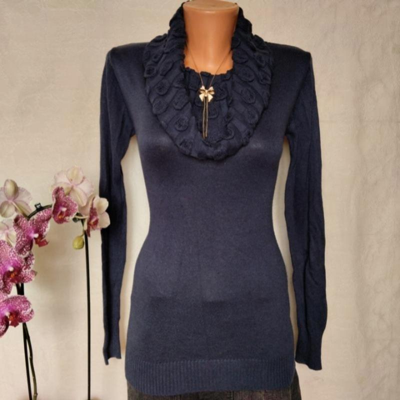 Классный тоненький свитер с шикарным воротником. Бирки отсутствуют, напоминает хлопок с акрилом. Замеры: длина 68 рукав 66 ширина 38-54,