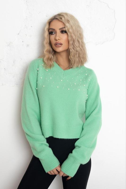 модель 283 Вкорочений светр з перлинами Розмір єдиний 44 до 48 Тканина Ангора Кольори: чорний, м'ята, молоко Замір по виробу в спокійному стані Довжина 52 см, рукав від горла 78 см, пог 52 см Увага!!! Перед використанням потребує відпарювання