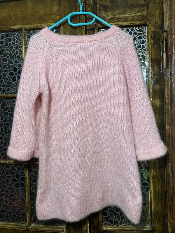 Теплий светр . Матеріал схоже на мохер . Є також пояс рожевий . Є невеличка плямка , в носці не видно . Ширина між пахвами -50 см , півобхват стегон -50 см Довжина светру -68 см, довжина рукава -50 см , рукав укорочений