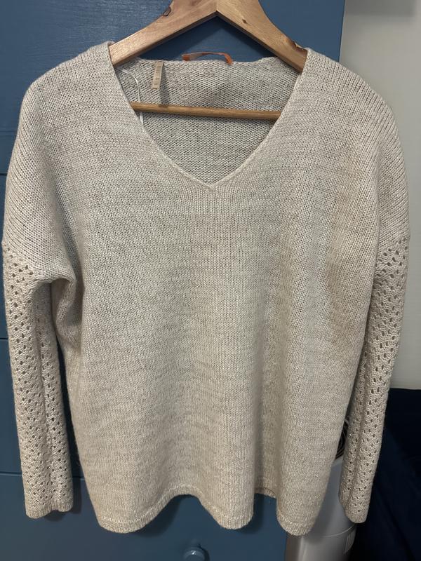 Гарний светр hugo boss, з ажурними рукавами. За рахунок золотистого волокна трошки переливається