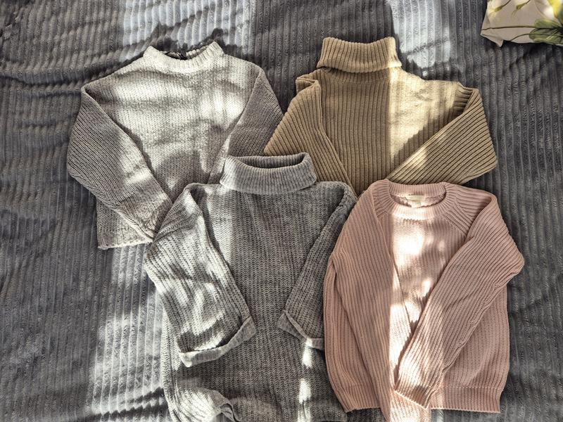 1 фото: Серый свитер от фирмы H&M, размер хс, но подходит и на с, цена 235грн. 2. Бежевый укороченный с закатанным рукавчиком ginatriсот, размер с, цена 250грн 3. Серый свитер от фирмы zebra, размер хс/с, рукав укороченный, цена 130 грн 4. Светоражевый от фирмы H&M, размер с, ценил 235грн. 2 фото: 1. Коричневый свитер от фирмы KappAhl в размере хс, цена 180 грн 2. Продленный свитер от фирмы Zara, в размере м, цена 377грн.