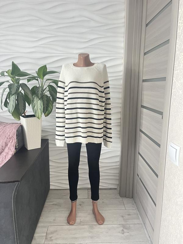 Молочна кофта в темно-сині смужки, вільного крою, з довгими рукавами та еластичними манжетами. Стильна, зручна й універсальна для щоденного образу.