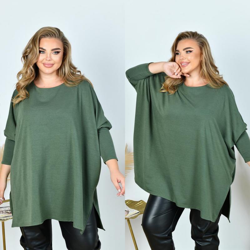 Код 3670 Ціна 740 грн. Тканина: двонитка. Колір: марсала, хакі, чорний, фіолетовий, яскраво-синій. Розміри: 52-58, 60-66. Довжина тунікі: 81, 82 см. Довжина рукава от горл.: 71, 74 см. Обхват рукава: 50, 55 см. Заміри готового виробу: 52-58 ОГ 184 ОТ 182 ОС 176 60-66 ОГ 210 ОТ 204 ОС 200 На моделі показано цей розмір 52-58❗️ Зріст моделі 170 см. Oб’єми моделі ОГ 108 ОТ 85 ОС 115 см. Неймовірно гарна туніка в стилі оверсайз із трикотажу двонитки ( розтяжність середня). Обʼємна туніка з круглим вирізом горловини. Низ оброблено боковими розрізами. Рукав оригінальної форми, від ліктя завужується. Кишень, застібок немає.