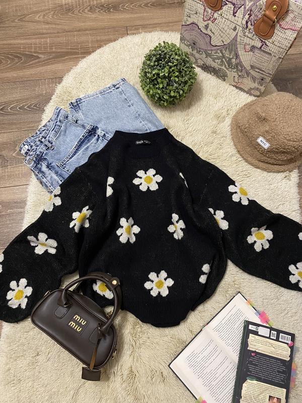 ❗️Кожна третя (найдешевша) річ у подарунок (1+1=3), за умов «оплати на картку»❗️Всі деталі в профілі «про мене»❗️ Светр з візерунками у вигляді ромашок розмір L, можна М, склад віскоза та нейлон, подвійної щільної машинної вʼязки, з обʼємними рукавами, довжина 57см., півобхват грудей 53см., низ 48см., довжина рукава від горловини 74см., в ідеальному стані.