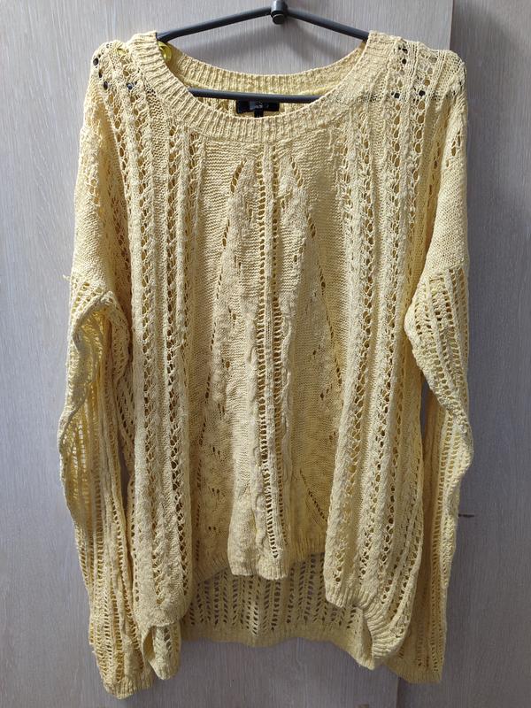 Изысканный женский свитер желтого цвета, просвечивается. Очень красиво смотрится, если надеть на топ, божи или майку. Размер М, но по фасону подойдет и на меньший и на больший размер. Сзади низ удлинен, в основном носится как туника.