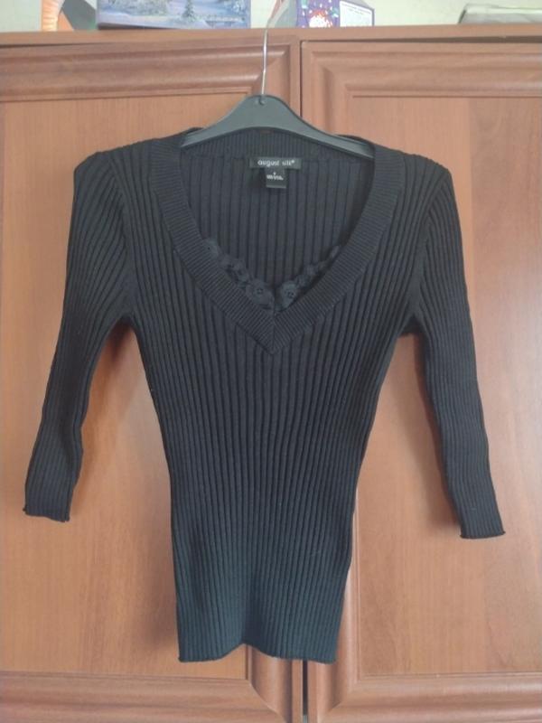 Очень классный ребристый свитер-полувер с V образным вырезом с кружевной отделкой и тремя четвертым рукавом. Хорошо тянется.