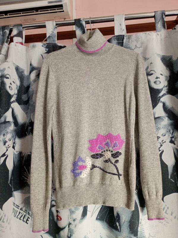 Чудесный мягкий нежный свитерок- гольфик! Отлично сядет на S,M! П.О груди 44см, длинна 65см, длинна рукава 64см.Состав пряжи на фото.