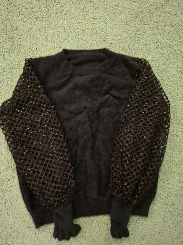 мягкий, теплый свитер, тянется, черного цвета, рукав плетеный с люрексом - по низу рукав на сетке стрейч, на запястье резинка с воланчиком, размер 44-46 (с-м), длина 55 см, рукав от плеча 63 см, плечи 40 см, ширина по груди 49 см