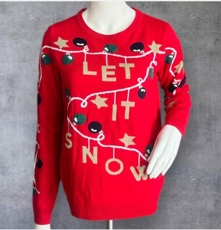 Новогодний, рождественский джемпер мелкой машинной вязки. Красный свитер с надписью "LET IT SNOW" и узором в виде гирлянды. Размер пишет S 36/38. Ориентируйтесь по фактическим замерам: обхват в груди 96см, потянется до 110см низ в обхвате 90см + тянется длина по спинке 63см длина рукава от плечевого шва 62см, от горловины 72см Ткань 100% полиакрил. Мягкий и приятный к телу. Также можно приобрести рождественские аксессуары: шапочку, бороду, очки Санты, ободочки на голову с колпаком Санты, Элльфа или рожками/ушками рождественского оленя.