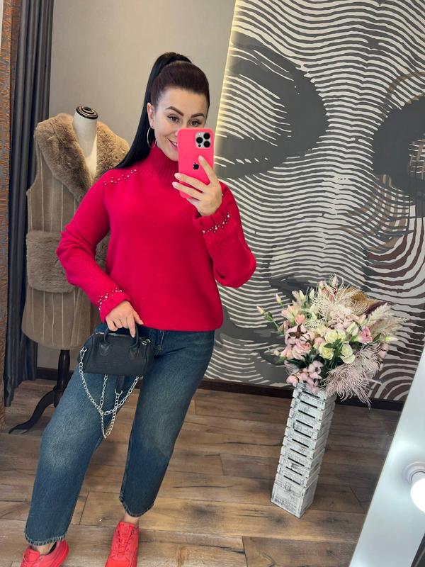 Бесплатная доставка до 06.11.2025! Невероятно красивый свитер с первого взгляда попадает в наши сердца и гардеробы, он изготовлен из качественного трикотажа машинной вязки с изящным рельефным узором, декорирован пришитыми стразами удобный крой свитера с воротником стойка, эффектными манжетами и на резинке внизу будет отлично смотреться на девушках с разными типами фигур, он согреет вас в прохладное время года и создаст хорошее настроение размер оверсайз 48-52 длина 62 см, объем груди по изделию 120 см, длина рукава от шеи 72 см код 0613