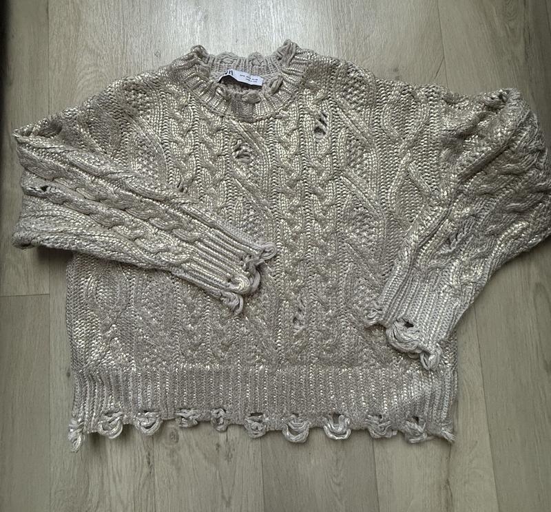 Золотистий в'язаний светр для жінок від Zara короткого крою.в складі вовна ,розмір М ,на обхват грудей 98-100,обхват талії 76-80,в ідеальному стані