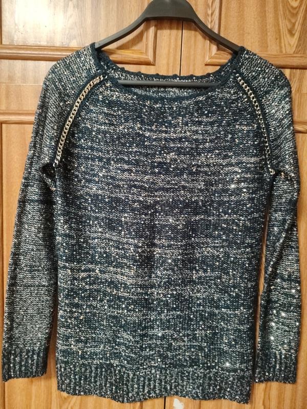 Свитер вязаный нитью с пайеткой, очень блестит на свету. Замеры по изделию: ПОГ 44 см, ПОТ 42 см, ПОБ 42 см, длина по спине от плеча 66 см, длина рукава от ворота 64 см.