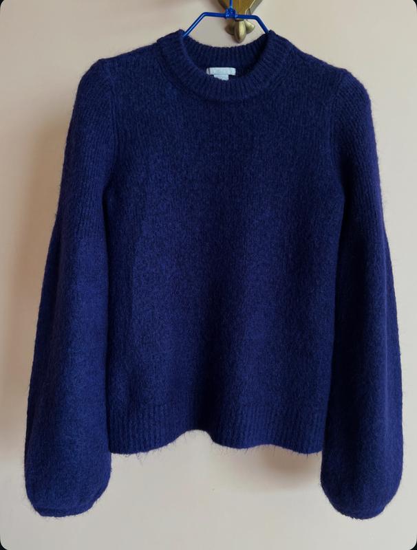 Стан нової речі, купувала за кордоном в офіційному магазині H&M. Дуже теплий і приємний до тіла. Вʼязка не тоненька, він щільний. Рукава обʼємні. У житті виглядає стильно. Колір насичений темно-синій, фото не передає. Довжина 62 см., довжина рукава 71 см., напівобхват грудей 45 см. але він тягнеться.