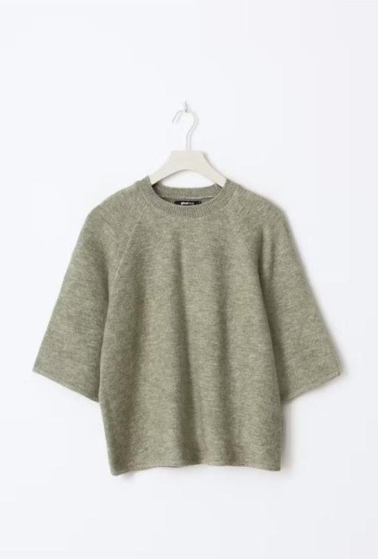 Вʼязаний мʼякий жіночий светр з короткими рукавами та вільним кроєм. Він має круглий виріз горловини і виконаний з суміші матеріалів, що включає акрил, поліестер, вовну, альпаку та еластан.