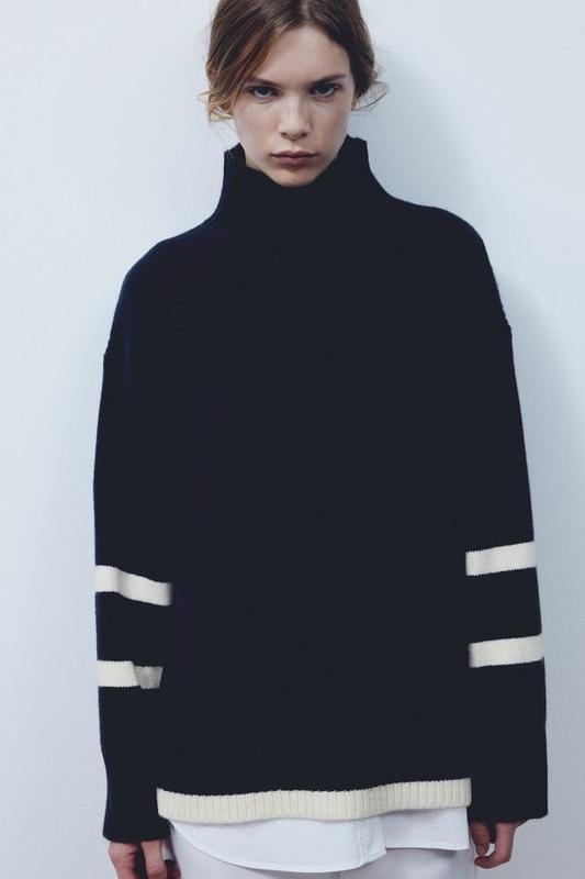 🖤темно-синий свитер с высоким воротником и белыми полосами на рукавах и внизу в идеальном состоянии без дефектов🖤 ✖️безопасной оплаты нет, без торга✖️ 🖤длина 69/72см🖤 🖤плечи 54см🖤 🖤рукава 49/65см🖤 🖤пог 59см🖤 🖤пот 59см🖤
