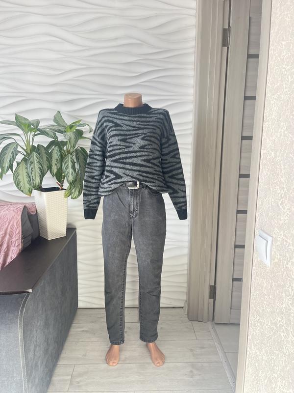 Светр сірий із чорним зебровим принтом, вільного крою, з круглою горловиною та довгими рукавами