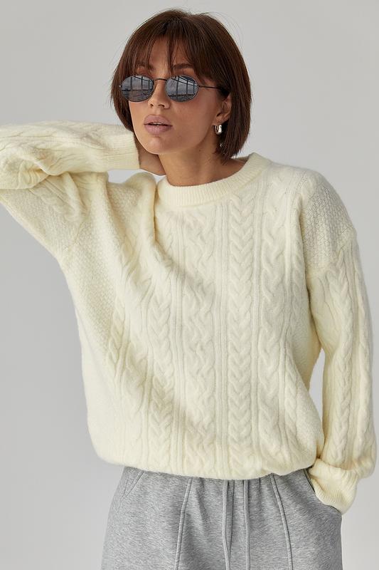 Вязаный свитер в косички – уютная и в то же время стильная модель, которая отлично сочетает классический узор и современный силуэт. Мягкая фактурная пряжа с рельефным плетением «косички» создает объем и добавляет образу выразительности, а полуприталенный крой гарантирует комфорт и свободу движений. Круглая горловина придает свитеру универсальный вид, делая его уместным как для повседневных, так и для более элегантных сочетаний. Опущенные проймы подчеркивают расслабленный характер модели, а длинные рукава и прямой низ завершены манжетами, хорошо держат форму. Такой свитер легко комбинируется с джинсами, юбками или классическими брюками, создавая множество стильных и теплых аутфитов.