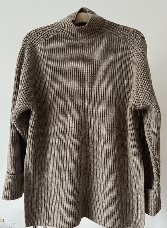 Теплый удлиненный свитер с горловиной-стойкой Комфортный удлиненный свитер в серо-бежевом оттенке (грейж). Идеален для холодного времени года. Фасон: длинный, с элегантной горловиной-стойкой и стильными боковыми разрезами. Состояние: В отличном состоянии, имеет минимальные колтуны, которые легко устраняются машинкой для стрижки. Цвет: Серо-бежевый (Greige).