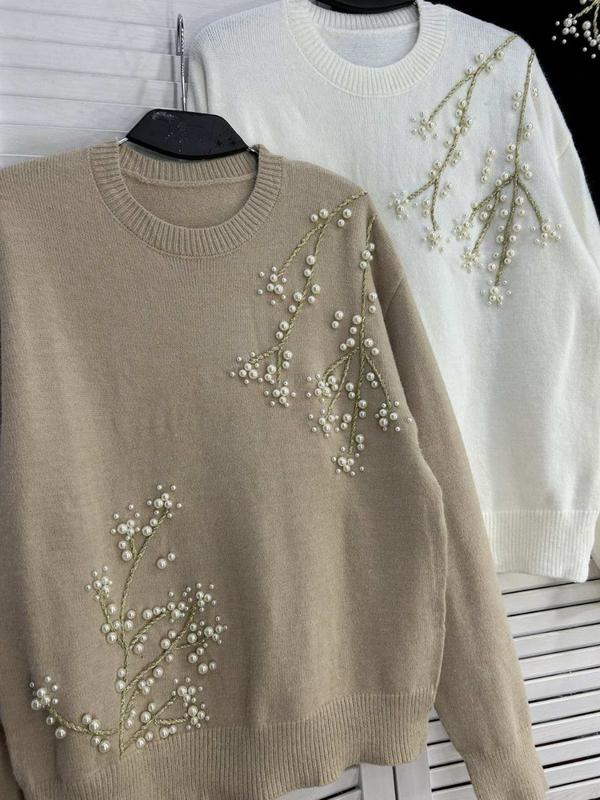Свитер с вышивкой с жемчужиной полуботал Модель:737leg Размер: 46-54 универсал Ткань: кашемир Длина 63 см, рукав 42 см Цвета: светлый беж, молочный, черный