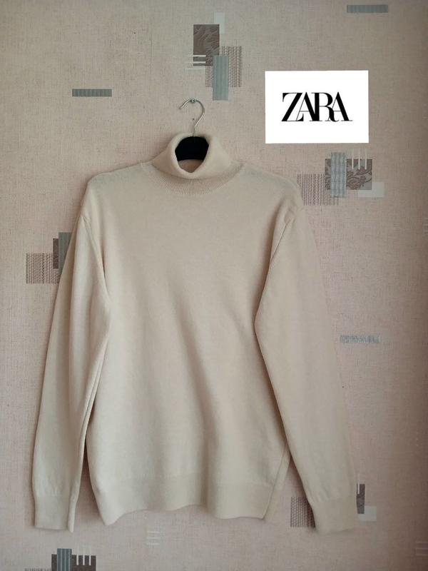 Очень красивый гольф от ZARA. В состав входит немножко кашемира и 27% шерсти, так что теплый. Цвет интересен - не просто белый, а с каким-то холодным подтоном. Ориентируйтесь по замерам. Длина 68 Полуобхват груди 54, тянется 61 Плечи 44 Рукав от шва 63 Свитер чистый, стирать не нужно. Не спрашивайте пожалуйста о наличии, можете оформлять доставку не попросив.