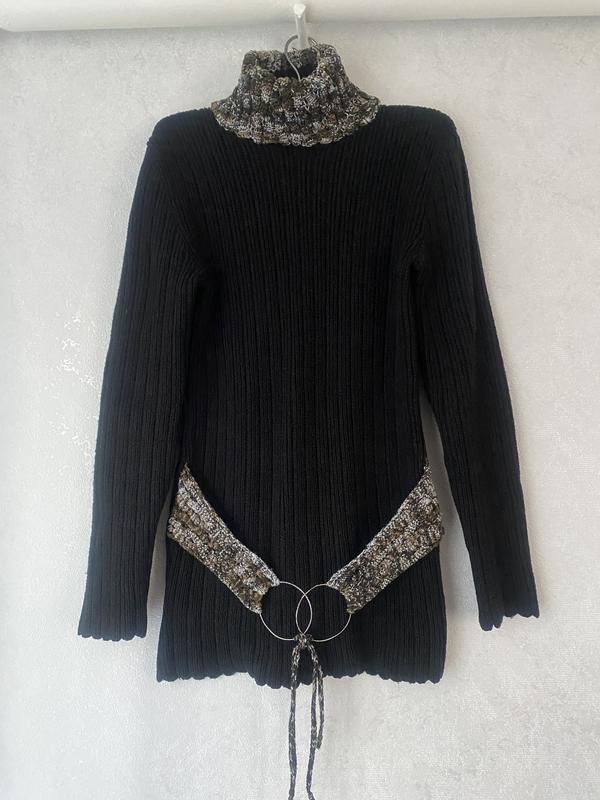 Подовжений светр з високим горлом, трикотаж щільної в'язки, теплий і зручний, розмір 42-44, у відмінному стані, довжина 67 см., Довжина рукава 60 см., Від плеча до плеча 35 см., Напівобхват грудей 36 см., Стегон 37 см. Колір чорний.