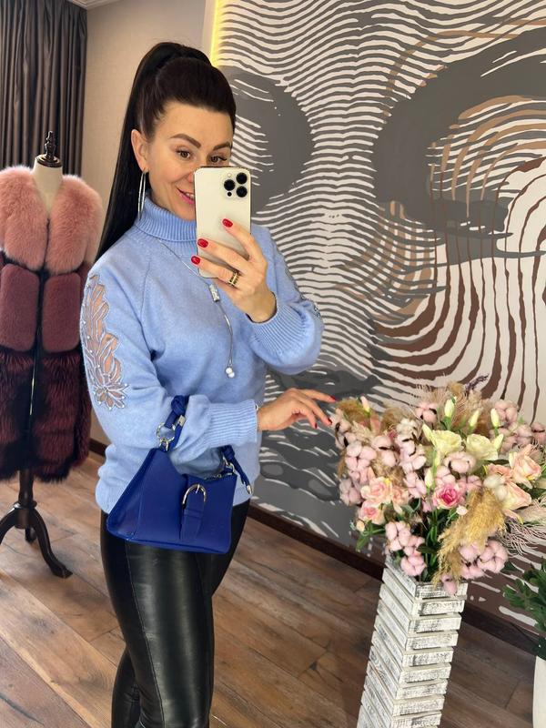 Теплый, комфортный и эффективный свитер с высоким горлом выполнен из приятного к телу трикотажа рельефной машинной вязки высокого качества, декорированного аппликацией из прозрачной сетки и пришитых жемчужин, он согреет вас в прохладное время года и займет достойное место в вашем гардеробе В наличии голубой, синий, молочный и бежевый размер единственный 46-52 длина 60-62 см, пг 48-50 хорошо тянется, длина рукава от шеи 70-72 см код 0530