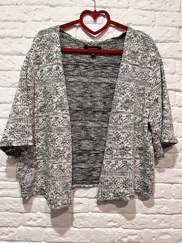 Кофта кардиган, орієнтовно розмір L. Якщо зацікавить, зроблю заміри. Склад: 70 % поліестер, 30% котон.