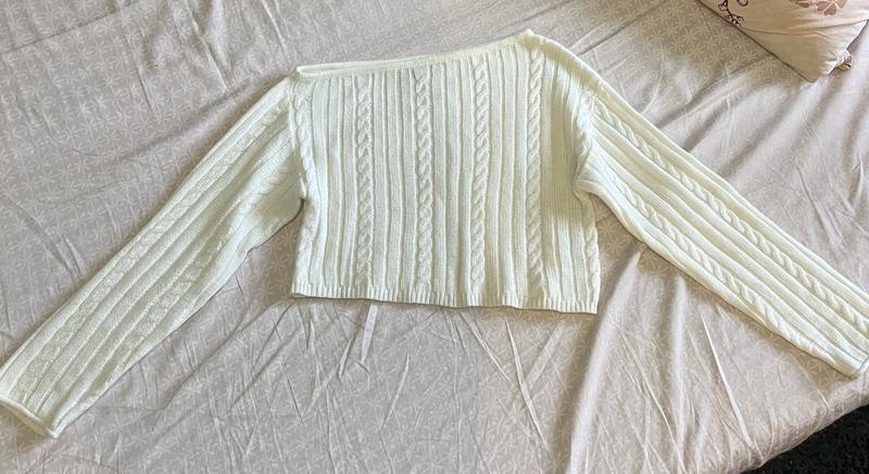 короткий свитер, с полу обнаженным правым плечом