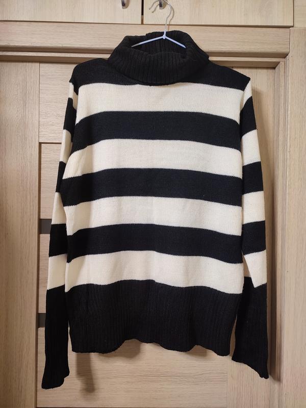 Свитер в полоску черно-белую, Janina, 44+ высокий воротник, который можно отногнуть в двое или влажняет, эластичная, мягкая вязка. в отличном состоянии. Местами являются маленькие незначительные катышки, которые легко убрать. замеры ног 54-70 по низу 43-75 рукав 64 от горловины 78 в бицепсе 20-30 длина по спинке 63 высота воротника 21