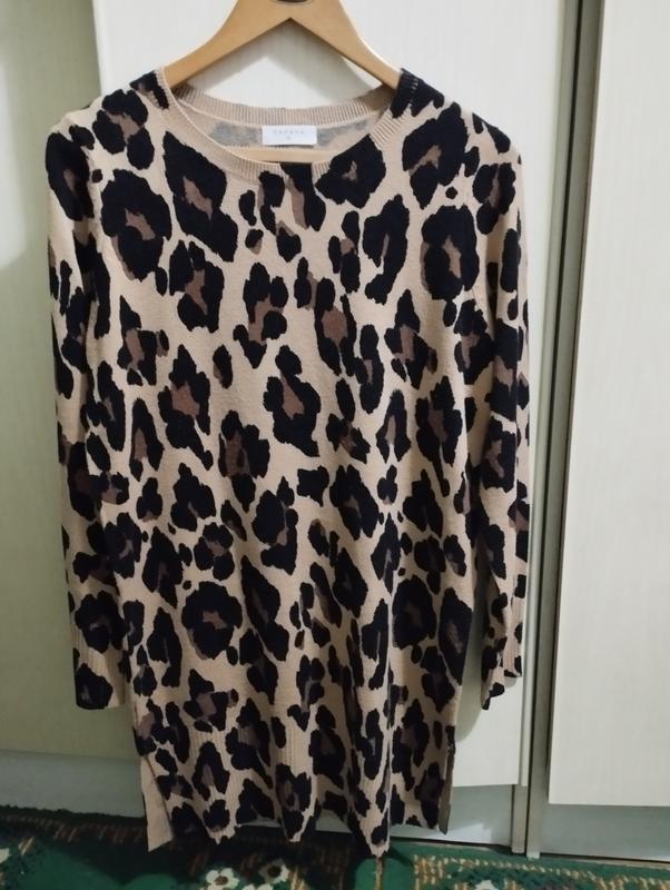 Свитер в хорошем состоянии, удлиненный, леопардовый принт, тянется. Объем груди 53см., Длина рукава от горловины 73см., Длина 82см.