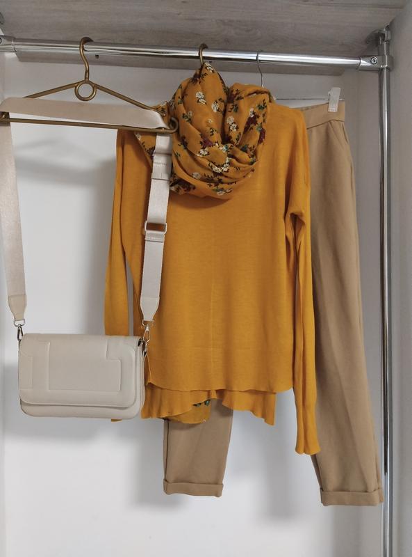 Класична однотонна кофтинка з довгим рукавом насичено жовтого кольору. Легка та зручна. Приємна на дотик. Гладка машинна в'язка. Нитка середньої товщини, більш до тонкої. Стрейч. Фасон прямий. Лягає по фігурі. Акуратний виріз. По спинці трохи довша. Стильно виглядає з шарфом в тон у комплекті (шарф може бути замінений, але в кольорі). Є розміри. 48р на пог-50-52 46р на пог-48-50