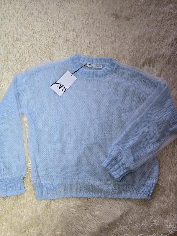 Невероятно нежный свитер паутинки с тюлевой вуалью, очень нежный голубой цвет. Абсолютно новый, с биркой. размер М замеры: ПОГ 57см, длина 58см, рукав от горловины 74см